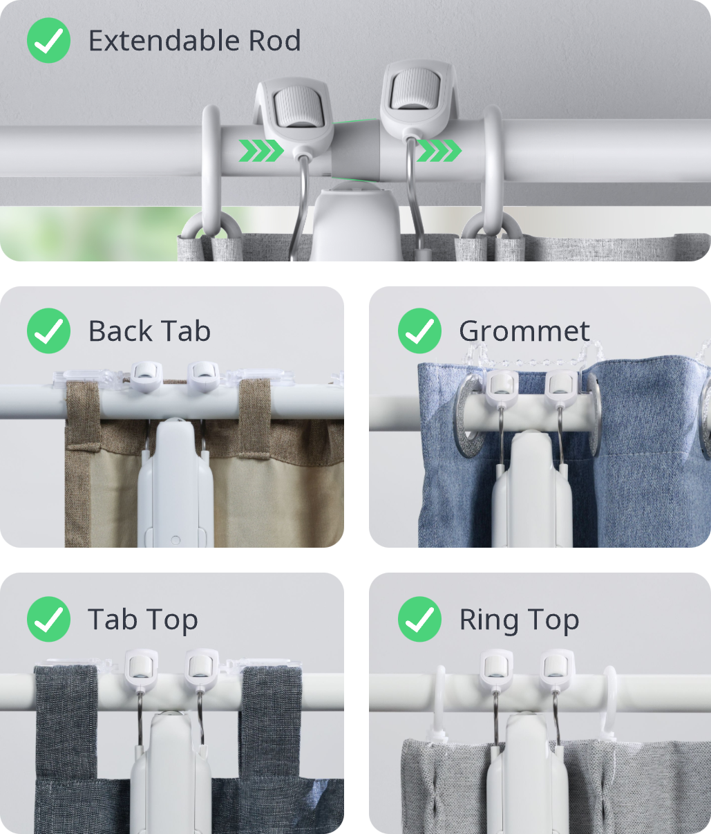 Fits almost any curtain track, SwitchBot Curtain 3 is compatible with a whole range of different curtain tracks. We've got something for almost everyone. Check compatibility >