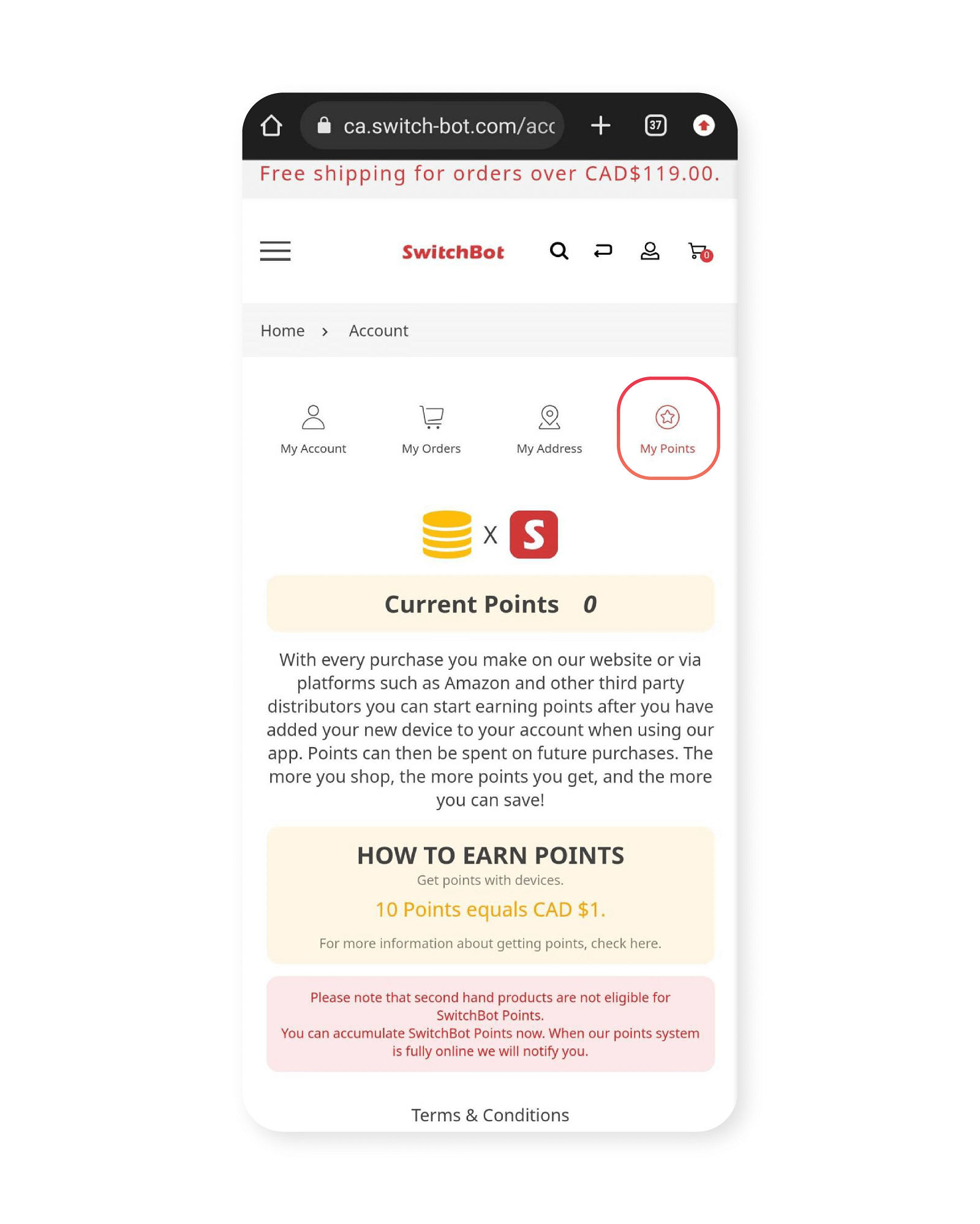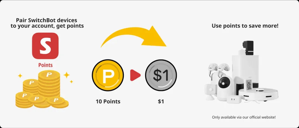 "SwitchBot Points" is a new loyalty program service that we have released that allows you to earn points by purchasing our products via our official website, Amazon or other retailers, and adding new devices to your SwitchBot app account. Points can then be used when purchasing goods on our website, with 10 points equalling $1.