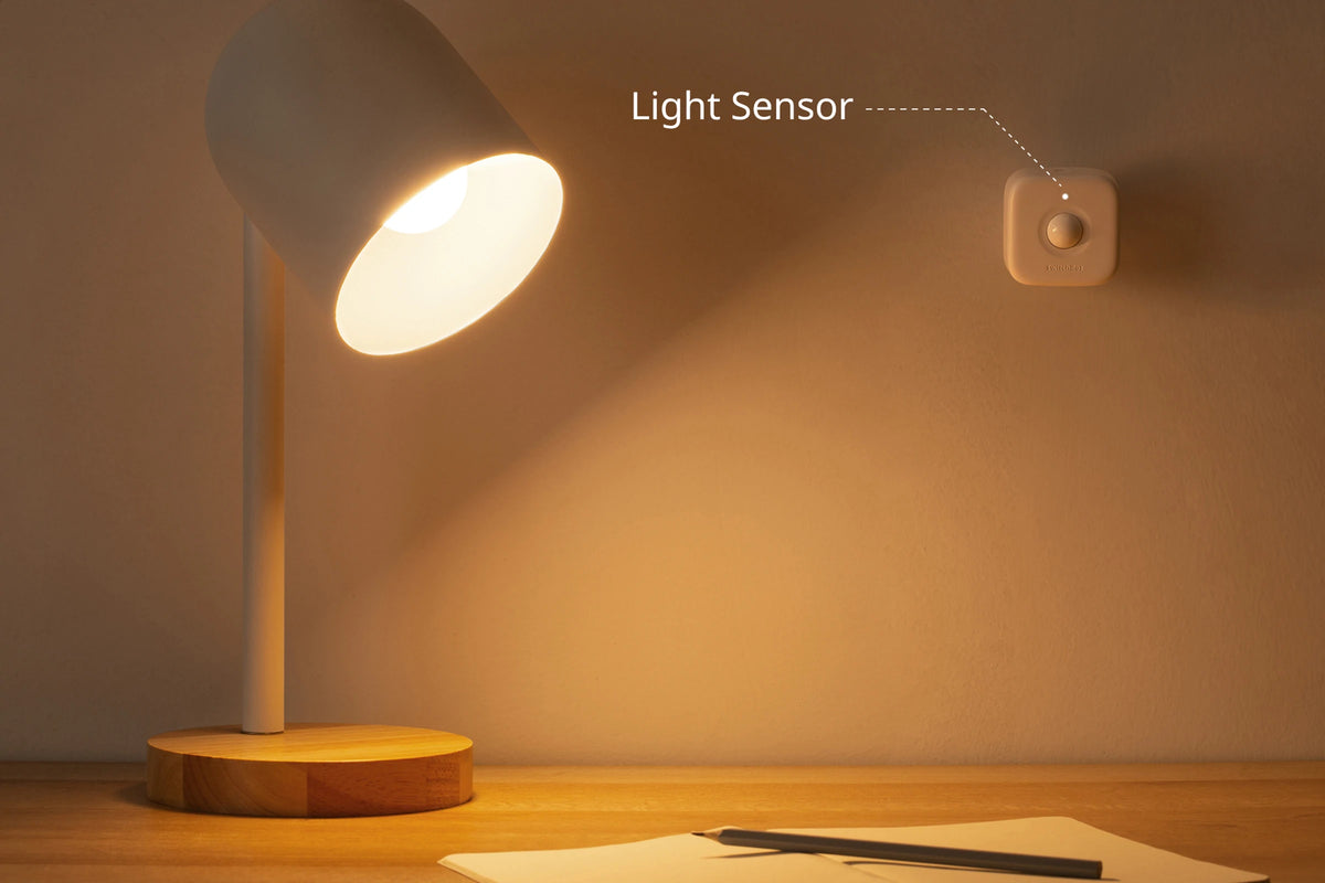 We’ve included a light sensor inside that can be used to detect what kind of light environment your surroundings are in. You can also define your light threshold to be bright or dark via our app. Then, when connected to SwitchBot Hub Mini, your Motion Sensor will be able to automatically turn your desk lamp on/off when it senses light.