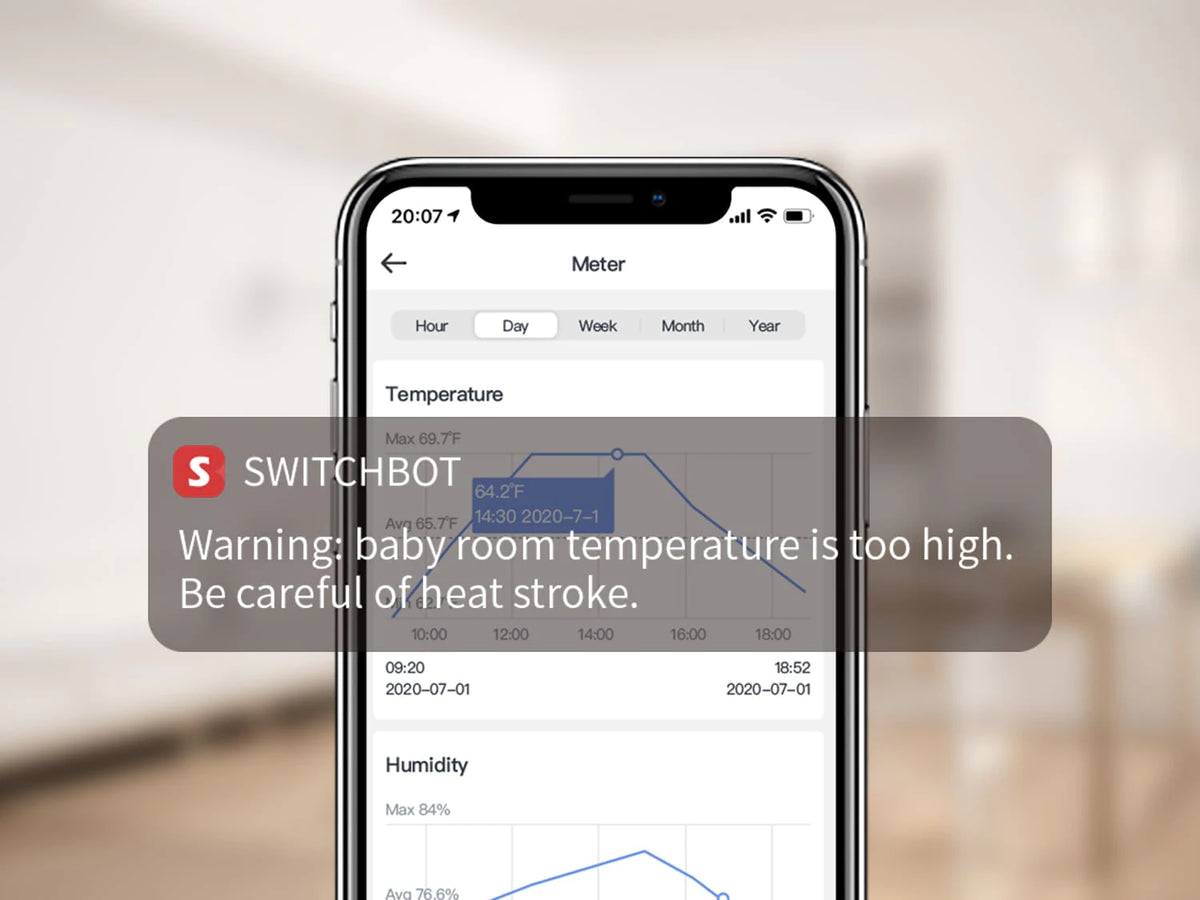 With our SwitchBot app, you’ll be able to get push alerts locally at home when using Bluetooth, or even remotely if you pair your SwitchBot Meter with a SwitchBot Hub Mini.* *Android users will require a SwitchBot Hub for push alert functionality.